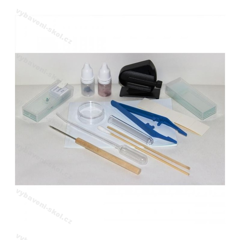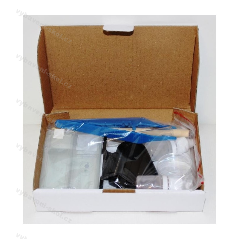 Základní preparační sada v papírové krabičce. Obsahuje pitevní jehlu, špejli, plastovou zkumavku, Petriho misku, pinzetu, preparáty, krycí skla, podložní skla, červené a modré barvivo, mikrotom a další.