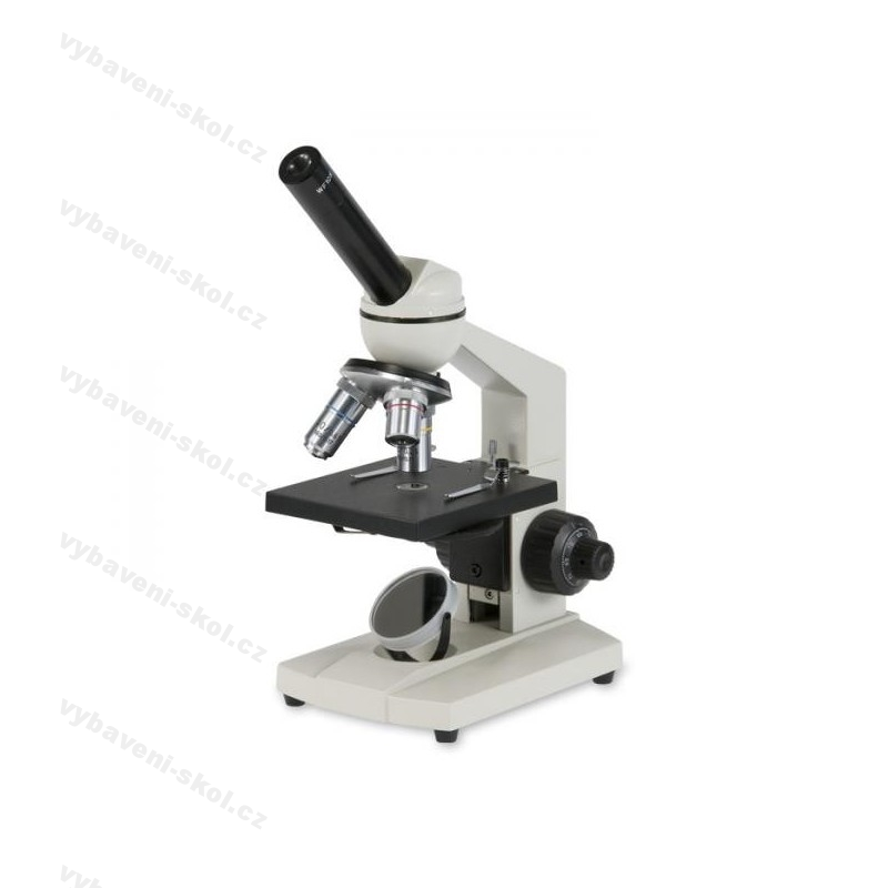Monokulární žákovský mikroskop. Achromatické DIN objektivy, zvětšení až 400x. Plankonkávní zrcátko průměru 40 mm.