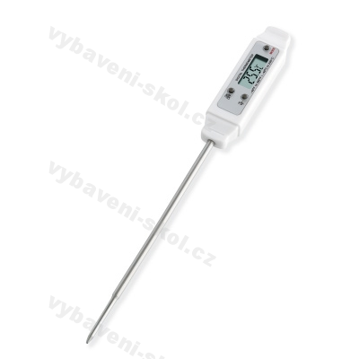 12,5 cm dlouhý měřicí hrot. K měření teploty kapalin, sypkých a měkkých substancí. Přepínání °C/°F, funkce min./max./hold. Provoz na knoflíkové baterie. Měřicí rozsah -40 °C až +200 °C, přesnost 0,8 °C. Velikost 20,5 x 2 x 1,7 cm, hmotnost 56 g.