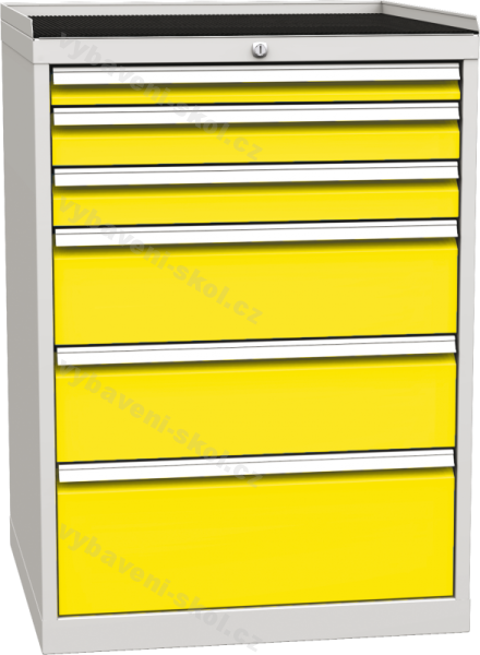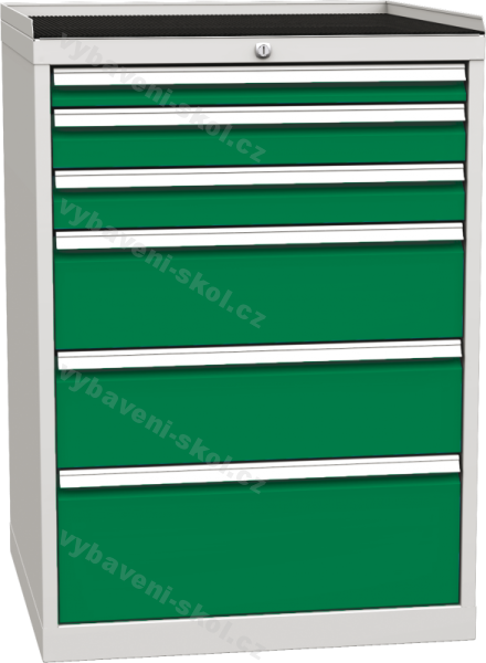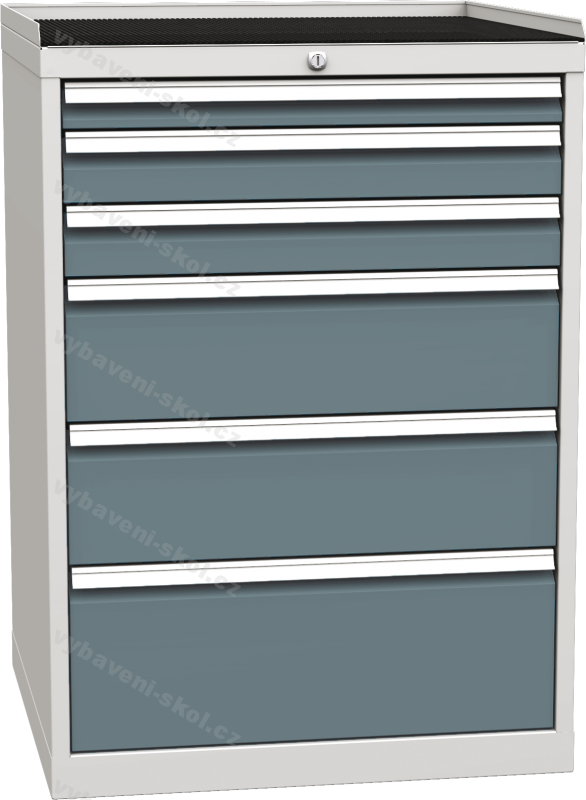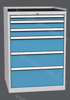 Více-zásuvkovou dílenskou skříňku tvoří masivní ocelový korpus šedé barvy RAL (plech 1,0 mm) s 6 uzamykatelnými zásuvkami. Horní deska skříňky je vybavena rámem s protiskluzovou výplní. Zásuvky s možností volitelnosti barvy RAL (nosnost až 80 kg) jsou vedené na ložiskových 75% výsuvech se systémem blokace proti vysunutí více zásuvek najednou. Lze objednat pozinkované nebo plastové dělící zásuvkové prvky. Celková nosnost zásuvkové skříňky 300 kg. (V případě, že si zvolíte zásuvkové dělení, napište do poznámky, které a jaký počet chcete zakoupit).