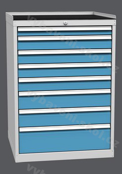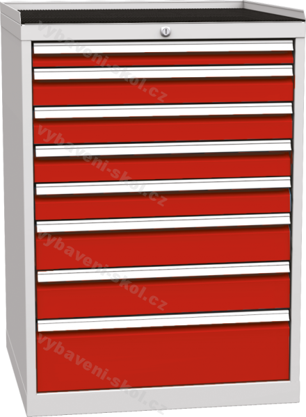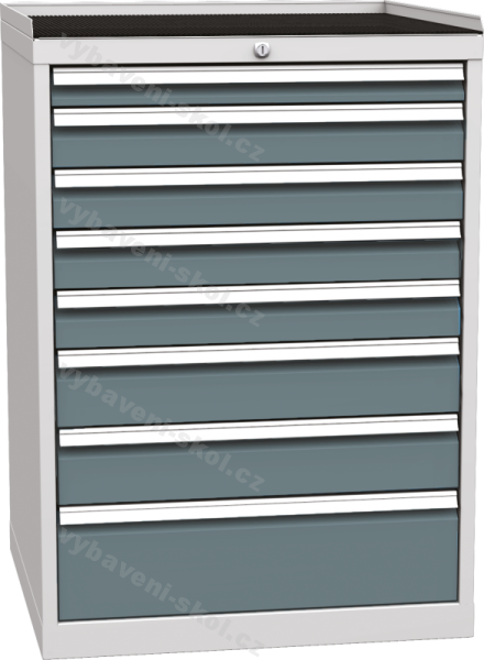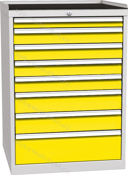 Členitý úložný prostor poskytuje jednosloupcová dílenská skříňka. 8 pevných zásuvek s nosností až 80 kg je vloženo do šedé svařované konstrukce barvy RAL z ocelového plechu (tl. 1,0 mm). Horní část skříňky je opatřena rámečkem s protiskluzovou výplní. Zásuvky s možností volitelnosti barvy RAL jsou vedeny na masivních ložiskových 75% výsuvech. Vnitřek lze vybavit pozinkovanými nebo plastovými dělícími prvky. Skříňka je centrálně uzamykatelná, zásuvky jsou vybaveny systémem blokace proti vysunutí více zásuvek najednou. Celková nosnost zásuvkové skříňky je 300 kg. (V případě, že si zvolíte zásuvkové dělení, napište do poznámky, které a jaký počet chcete zakoupit).