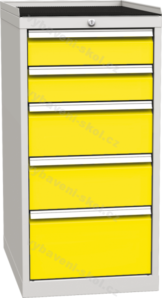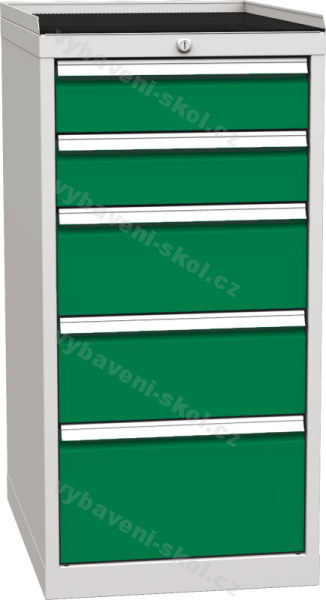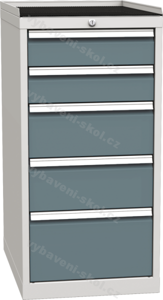 Zásuvková dílenská skříňka pro úschovu pracovního nářadí. Je vyrobena jako tuhý svařenec z ocelového plechu tl. 1,0 mm. šedé barvy RAL. Vnitřní prostor je vybaven pevnými zásuvkami s možností zvolit barevné provedení barvy RAL, vedenými ložiskovými 75% výsuvy, horní část skříňky je opatřena rámem a protiskluzovou pryží. Zásuvky s nosností 80 kg jsou připraveny na vložení pozinkovaných dělících prvků nebo plastových výplní. Skříňka má cylindrický zámek s centrálním mechanismem, blokaci proti vysunutí více zásuvek. Celková nosnost zásuvkové skříňky je 300 kg. (V případě, že si zvolíte zásuvkové dělení, napište do poznámky, které a jaký počet chcete zakoupit).