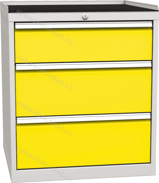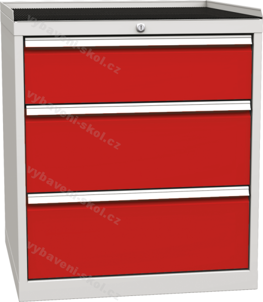 Zásuvková dílenská skříňka slouží k uložení nástrojů a materiálu přímo na pracovišti. Skříňka je konstruována jako tuhý svařenec šedé barvy RAL z ocelového plechu tl. 1,0 mm. Korpus skříňky je v horní části vybaven rámečkem s gumovou výplní bránící pádu drobných předmětů. Zásuvky ve více barevné nabídce barvy RAL jsou vedeny masivními ložiskovými 75% výsuvy, s nosností 80 kg. Vnitřní prostor zásuvek je připraven pro instalaci pozinkovaných plechových dělících prvků nebo je možno zásuvky vybavit plastovými výplněmi. Zamykání je řešeno cylindrickým zámkem s centrálním mechanismem. Součástí je systém blokace proti vysunutí více zásuvek najednou. (V případě že si zvolíte zásuvkové dělení, napište do poznámky, které a jaký počet chcete zakoupit).