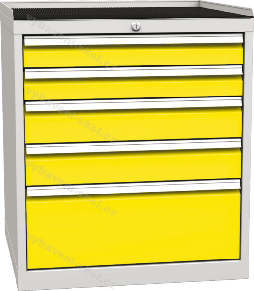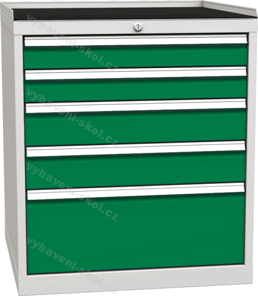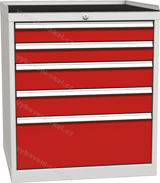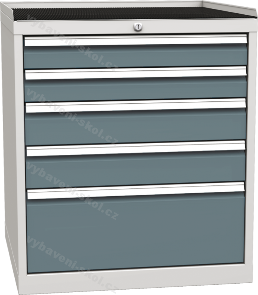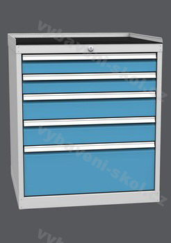 Efektivní úložný pracovní prostor poskytuje uzavřená zásuvková skříňka. 5 zásuvek (každá s nosností až 80 kg) je uloženo na ložiskových, 75% výsuvech uvnitř. Šedá ocelová konstrukce v barvě RAL je z materiálů (plech 1,0 mm). Zásuvky jsou volitelné barvy RAL a lze je vybavit pozinkovanými nebo plastovými dělícími prvky, jsou opatřeny centrálním cylindrickým zámkem s blokací proti vysunutí více zásuvek najednou. Horní odkládací plocha skříňky je zakončena rámečkem s gumovou výplní. Nosnost zásuvkové skříňky 300 kg. (V případě, že si zvolíte zásuvkové dělení, napište do poznámky, které a jaký počet chcete zakoupit).