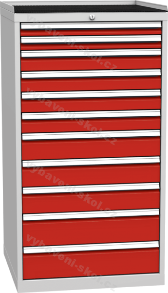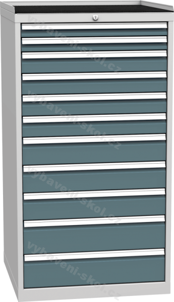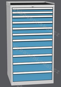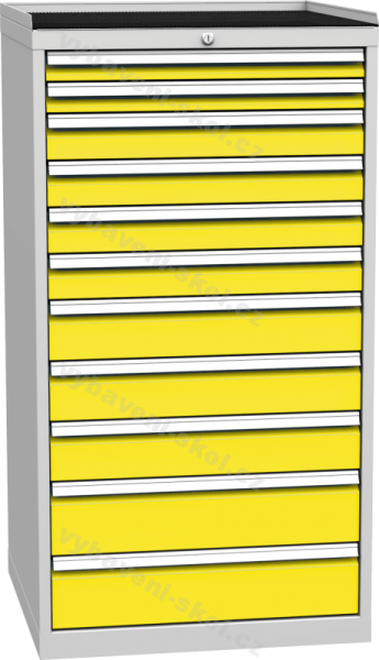 Svařovaná dílenská skříňka k ukládání pracovního materiálu a nářadí. Konstrukce je zhotovena z ocelového plechu silného 1,0 mm, šedé barvy RAL na ložiskových 75% výsuvech je uloženo 11 zásuvek s možností výběru barvy RAL, různých rozměrů s nosností až 80 kg. Plastové nebo pozinkované dělící výplně lze objednat, zásuvky jsou opatřeny systémem blokace proti vysunutí více zásuvek najednou. Zamykání je centrální. Skříňka je v horní části zakončena odkládací plochou, tvoří ji rám s gumovou výplní. Celková nosnost zásuvkové skříňky je 300 kg. (V případě, že si zvolíte zásuvkové dělení, napište do poznámky, které a jaký počet chcete zakoupit).