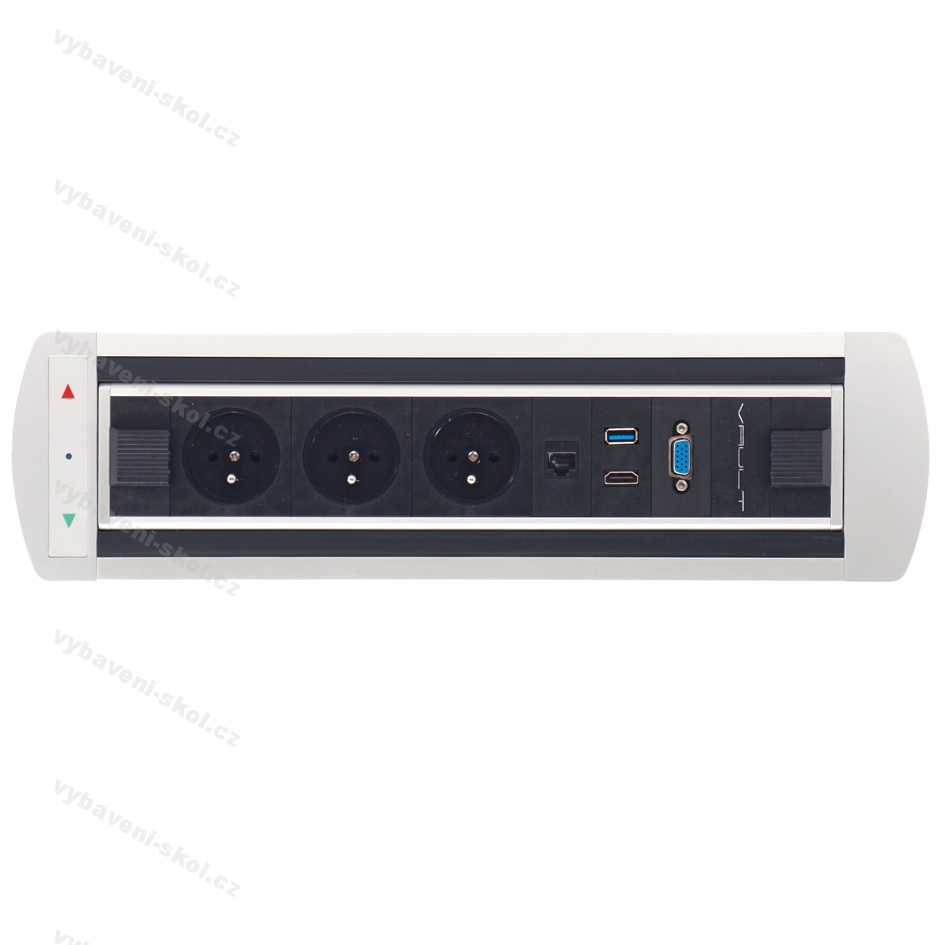 3 x elektrická zásuvka 220 V, 1 x datová zástrčka kategorie 5E, VGA, USB 3.0, HDMI.