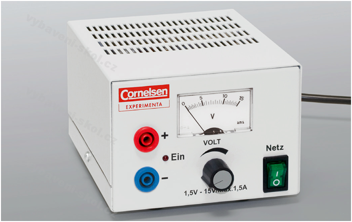 Zdroj výrobce Cornelsen Experimenta. Plynule nastavitelné výstupní napětí 1,5 - 15 V, maximální zatížení 1,5 A. Certifikace CE. Teplotní ochrana, ochrana proti zkratu. Výstupní napětí galvanicky odděleno, stabilizováno a vyhlazeno.