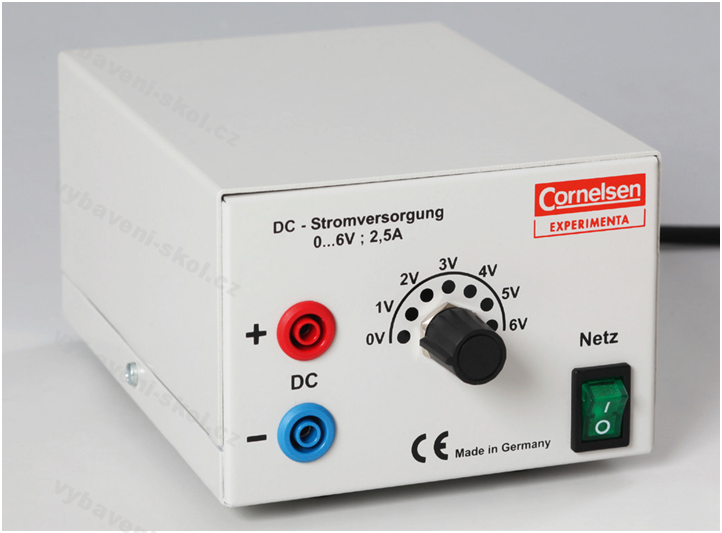 Zdroj stejnosměrného napětí výrobce Cornelsen Experimenta. Skokově nastavitelné výstupní napětí 1 - 6 V po 1 V, maximální zatížení 2,5 A. Certifikace CE.